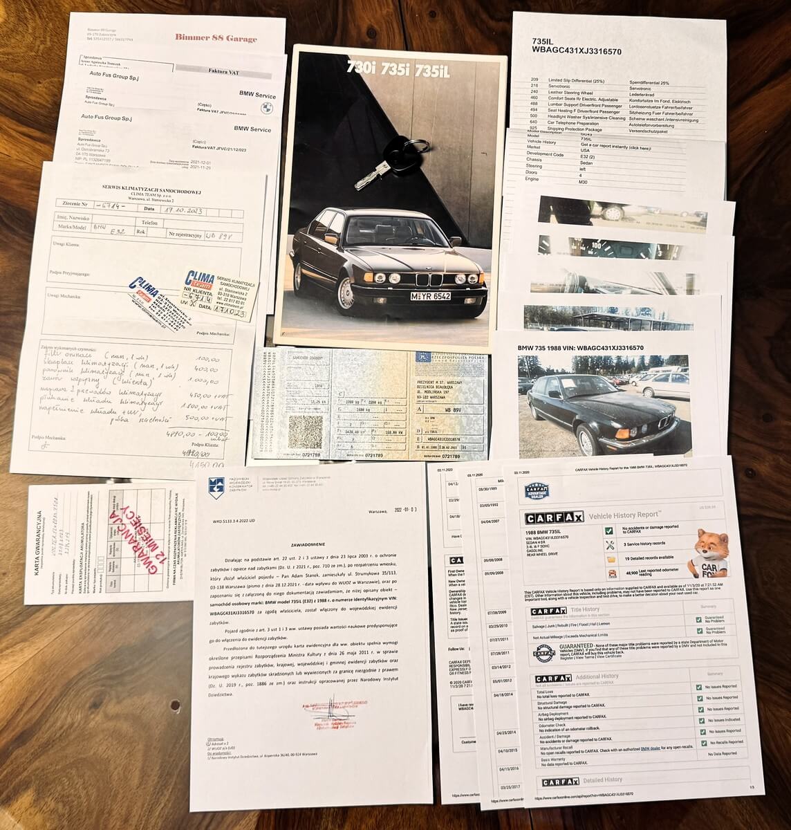 Oferowany egzemplarz wyprodukowano na rynek amerykański, sprzedany na Florydzie, następnie większość życia spędził u jednego właściciela w przyjaznym klimacie stanu Waszyngton. Zaimportowany do Polski przez miłośnika klasycznych BMW dopiero w roku 2021. Zarejestrowany jako pojazd zabytkowy i używany okazjonalnie od sezonu 2022 r. prywatnie przez Prezesa Fundacji związanej z klasyczną motoryzacją w Polsce. Żółte tablice otrzymał na podstawie wpisu do ewidencji wojewódzkiego mazowieckiego konserwatora zabytków (nie muzeum, nie kolekcja). Oczywiście posiada „czysty” raport Carfax oraz dokumentację zdjęciową z importu.