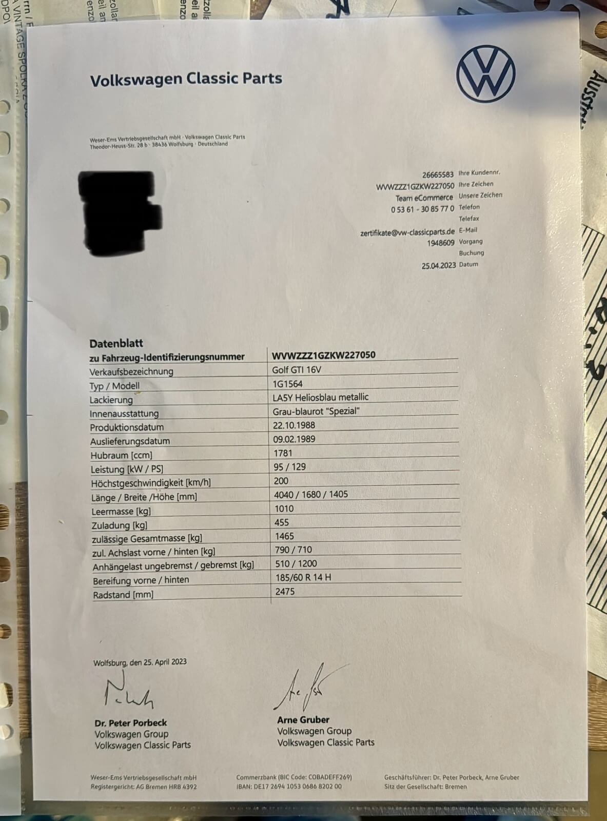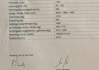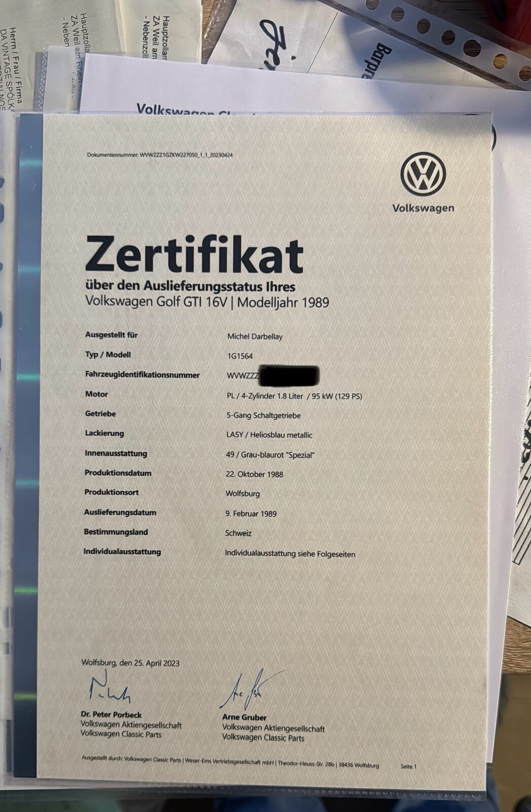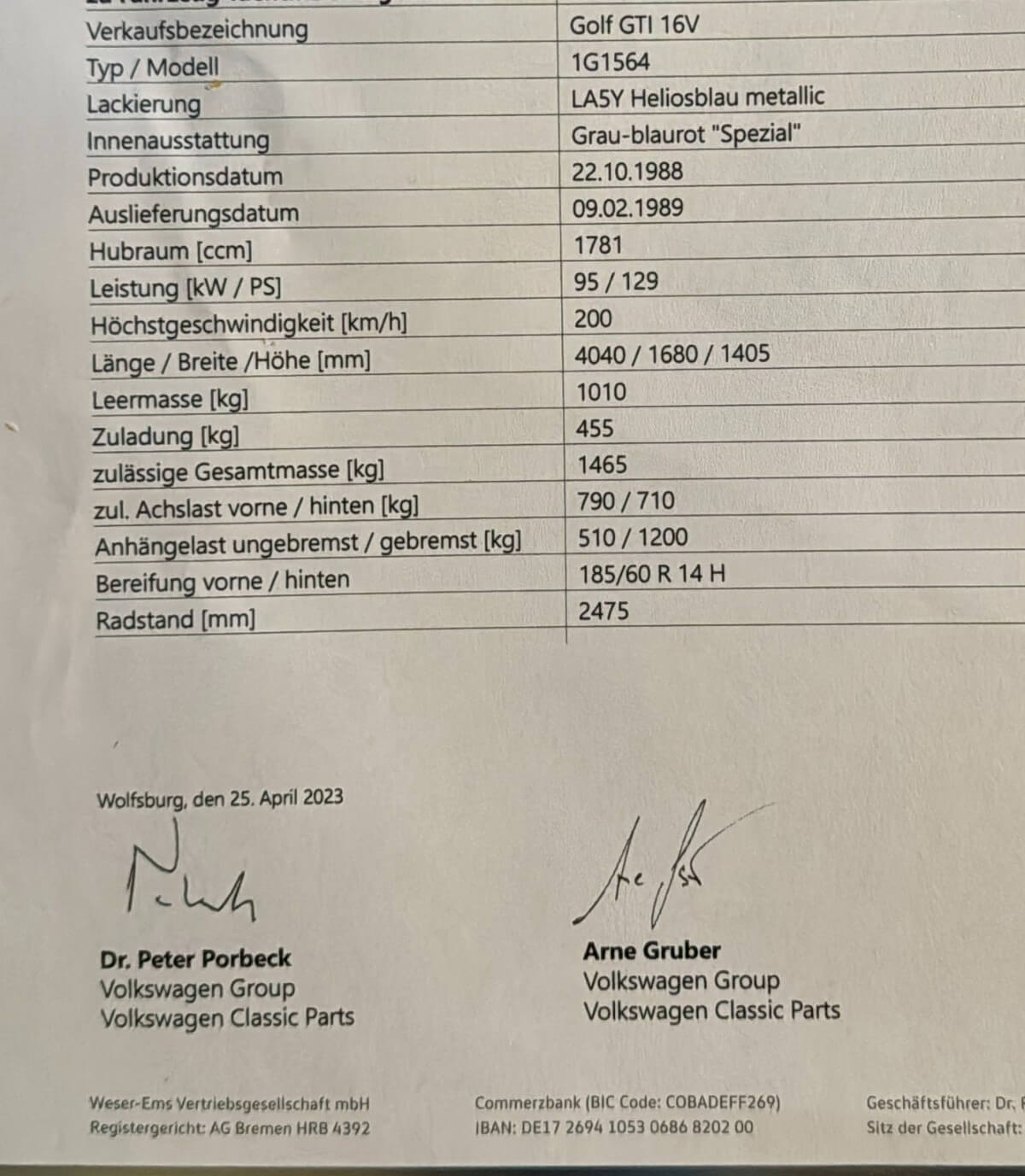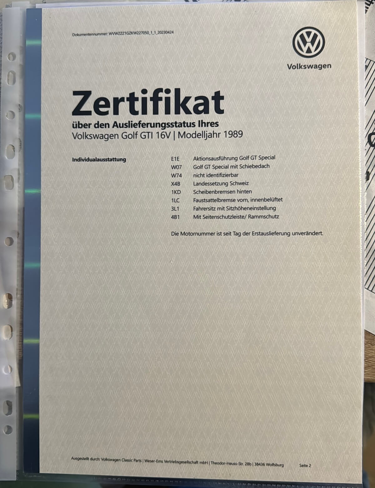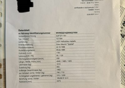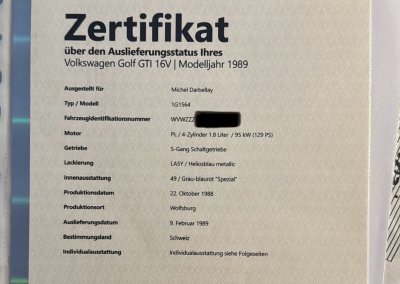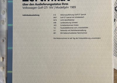 Samochód miał w 2023 roku wykonany certyfikat oryginalności VW Classic z potwierdzeniem fabrycznej specyfikacji oraz nr silnika i skrzyni. Był traktowany hobbystycznie przez lata. Wyjątkowa konfiguracja: 16-zaworowe GTI w wersji Special z indywidualnym wyposażeniem takim jak: szyberdach, licznik digital, hamulce tarczowe tył, wentylowane tarcze przód, dodatkowa regulacja wysokości fotela. Z katalogu akcesoriów wybrano: felgi Ronal, lampy Hella Black, kierownica skórzana 16V, gałka biegów akcesoryjna piłeczka i oryginalna. Według danych po nr homologacji w Bundesamt für Strassen ASTRA był to ostatni Golf GTI 16V w wersji Special zarejestrowany w Szwajcarii z ważnym badaniem technicznym.