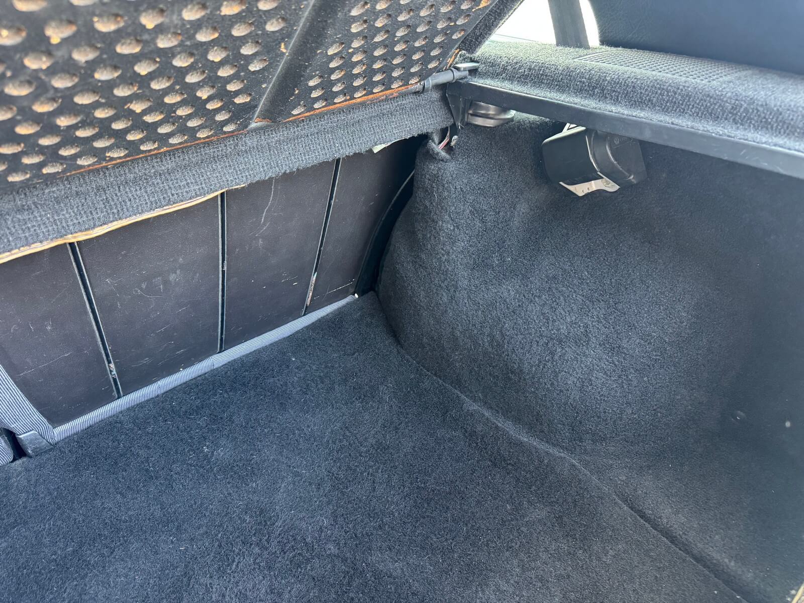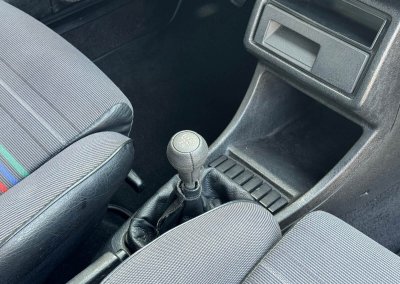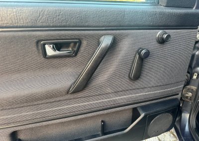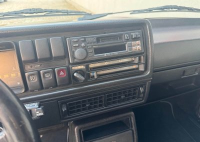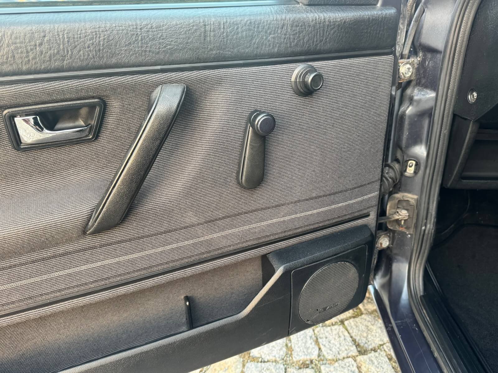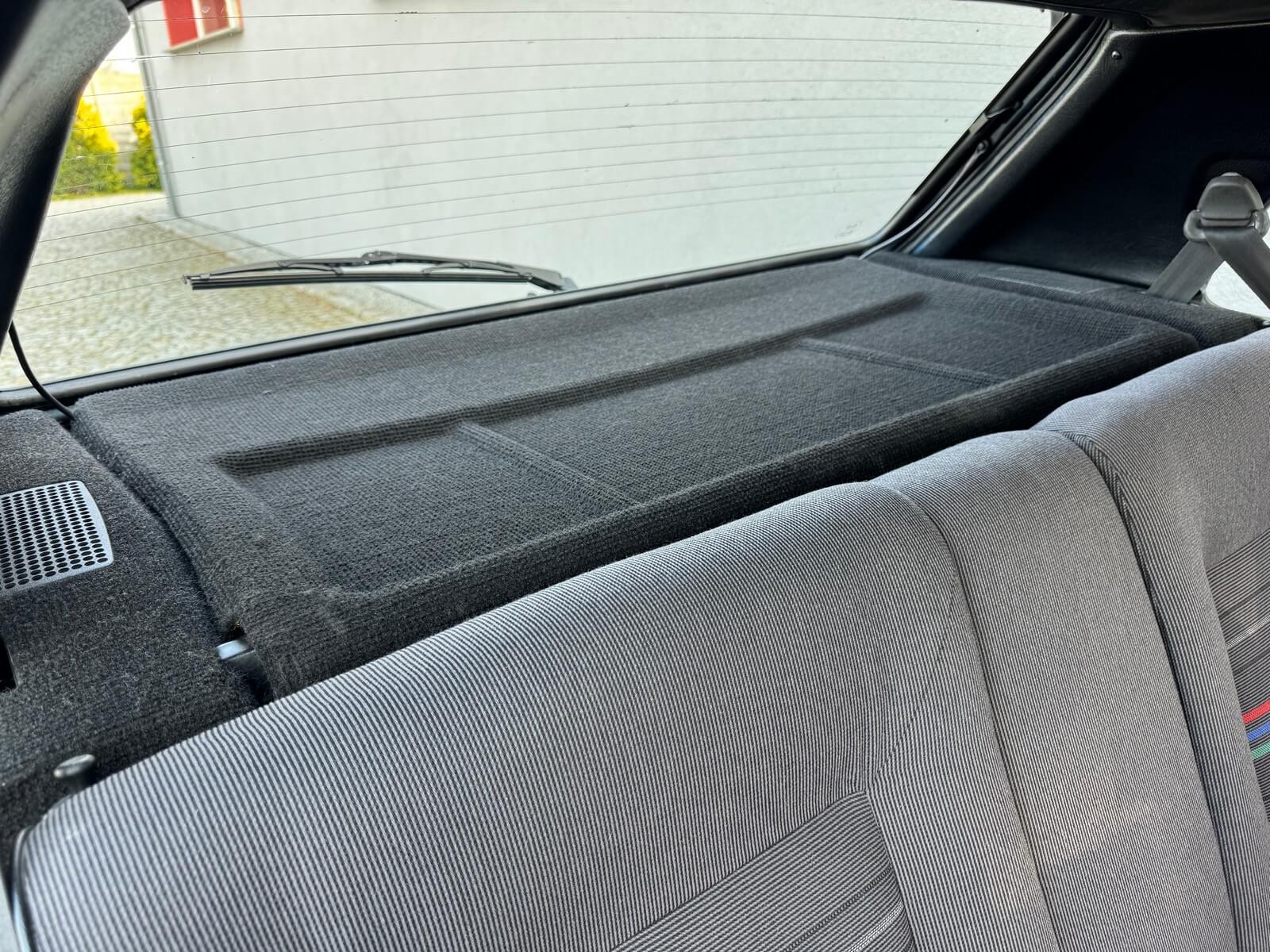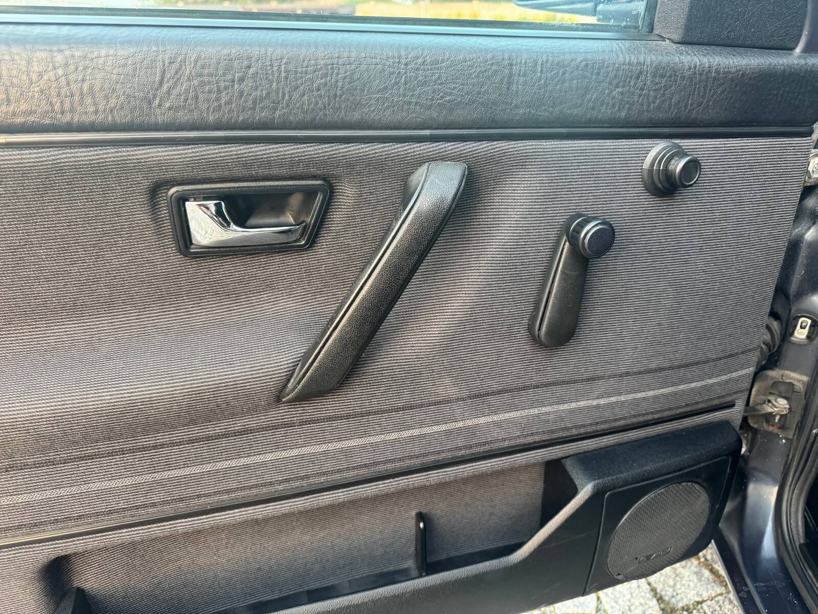 Wnętrze kompletne bez widocznych uszkodzeń. Tapicerka i wszystkie elementy wciąż oryginalne, nie zniszczone. Brak uszkodzeń materiału. Podsufitka czarna, materiał odchodzi w kilku miejscach. Ogólny stan bardzo ładny bez uwag. Radio Philips z 1989 roku, cztery głośniki. Dywaniki jak nowe. Tylna półka w stanie idealnym bez dziur czy uszkodzeń. Dwie gałki zmiany biegów: oryginalna oraz akcesoryjna piłeczka.