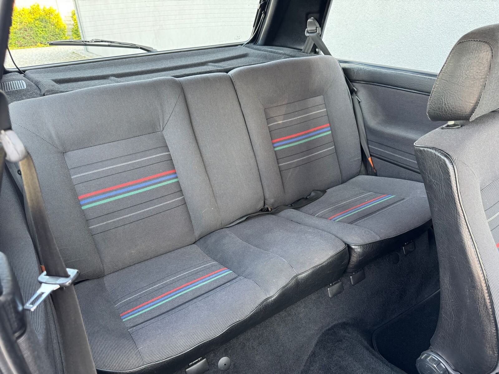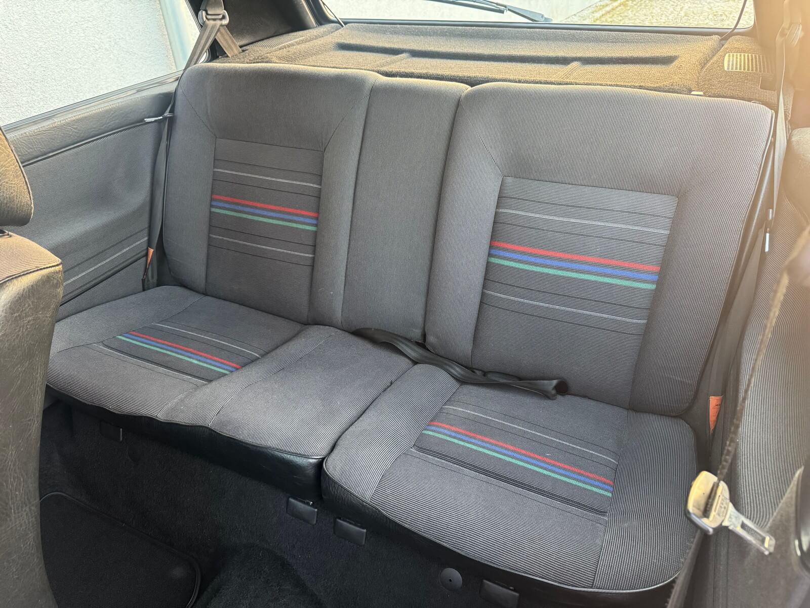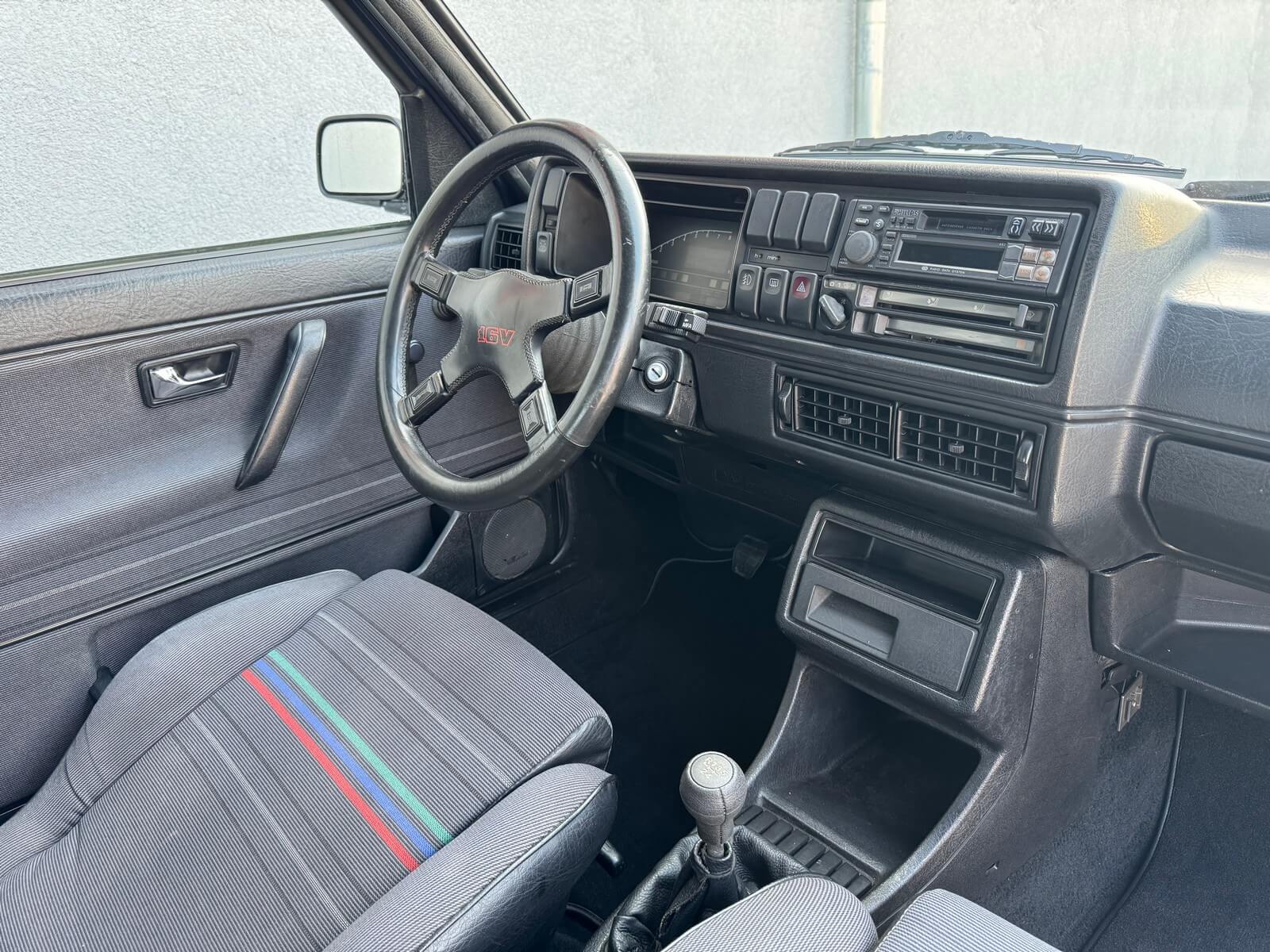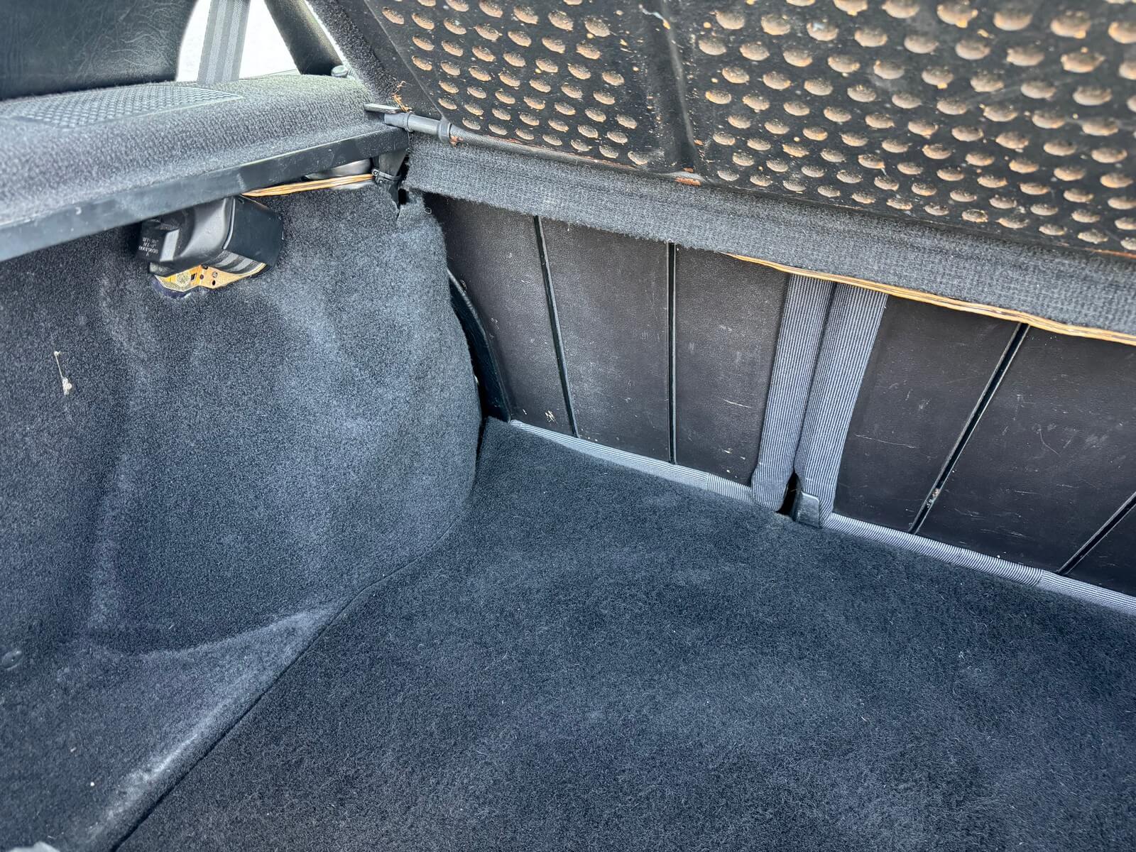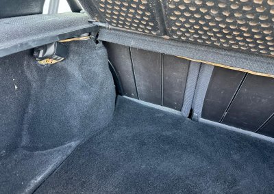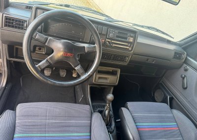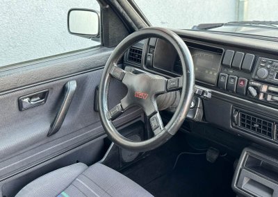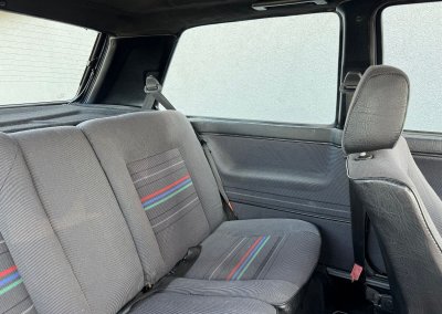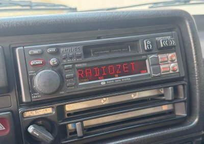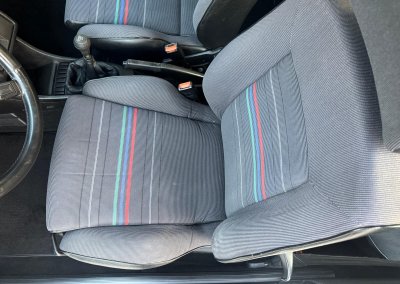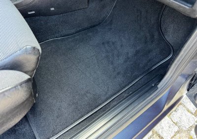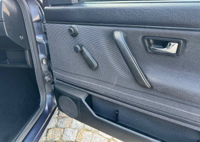 Wnętrze kompletne bez widocznych uszkodzeń. Tapicerka i wszystkie elementy wciąż oryginalne, nie zniszczone. Brak uszkodzeń materiału. Podsufitka czarna, materiał odchodzi w kilku miejscach. Ogólny stan bardzo ładny bez uwag. Radio Philips z 1989 roku, cztery głośniki. Dywaniki jak nowe. Tylna półka w stanie idealnym bez dziur czy uszkodzeń. Dwie gałki zmiany biegów: oryginalna oraz akcesoryjna piłeczka.