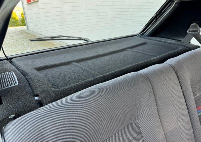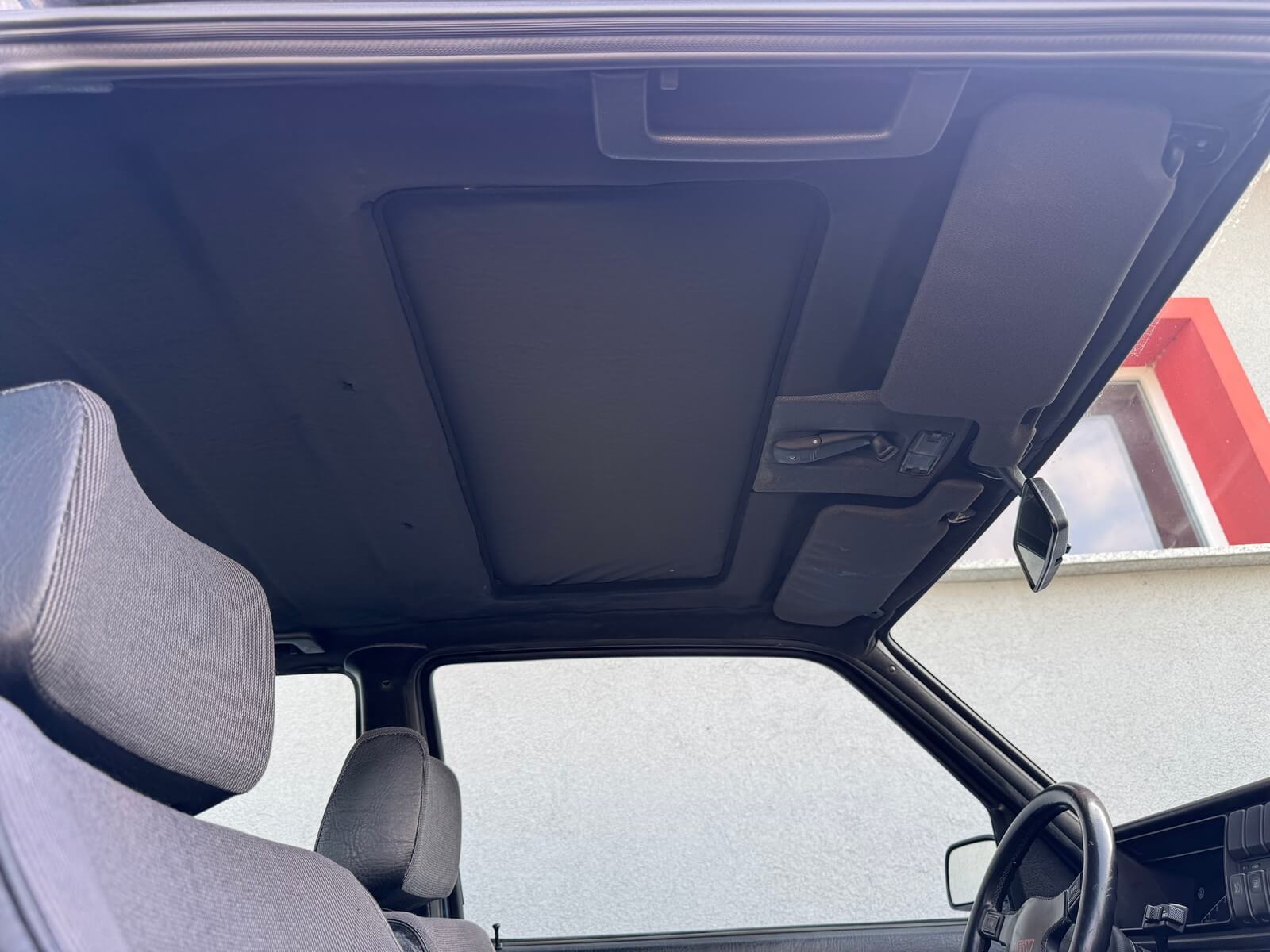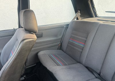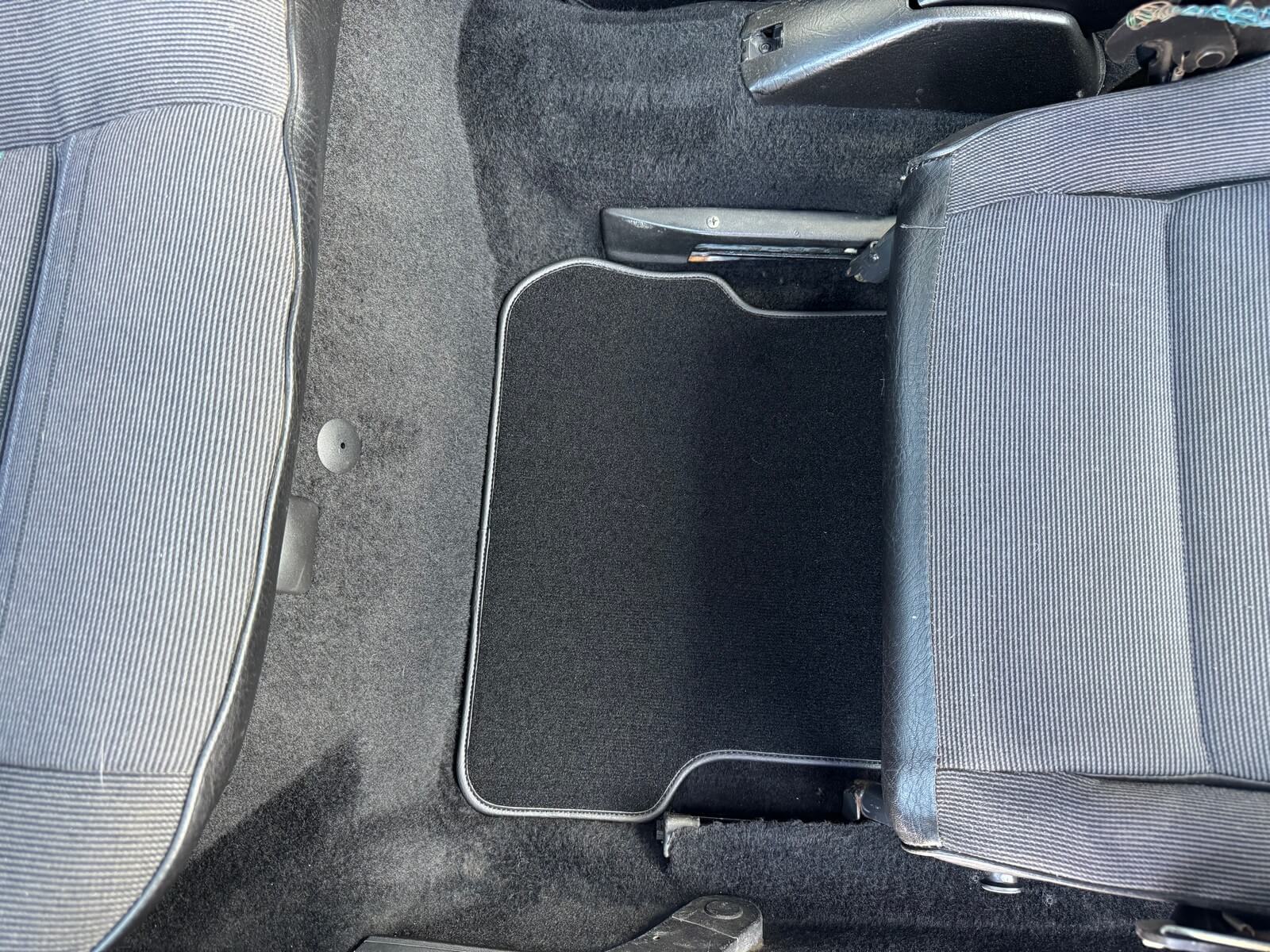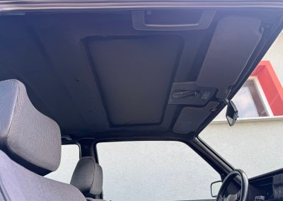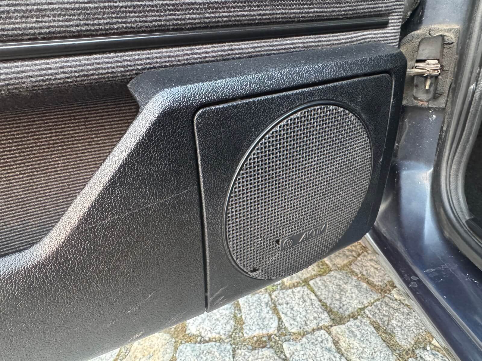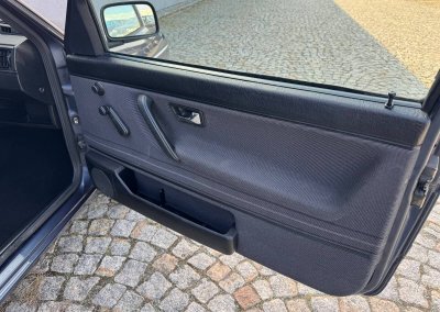 Wnętrze kompletne bez widocznych uszkodzeń. Tapicerka i wszystkie elementy wciąż oryginalne, nie zniszczone. Brak uszkodzeń materiału. Podsufitka czarna, materiał odchodzi w kilku miejscach. Ogólny stan bardzo ładny bez uwag. Radio Philips z 1989 roku, cztery głośniki. Dywaniki jak nowe. Tylna półka w stanie idealnym bez dziur czy uszkodzeń. Dwie gałki zmiany biegów: oryginalna oraz akcesoryjna piłeczka.