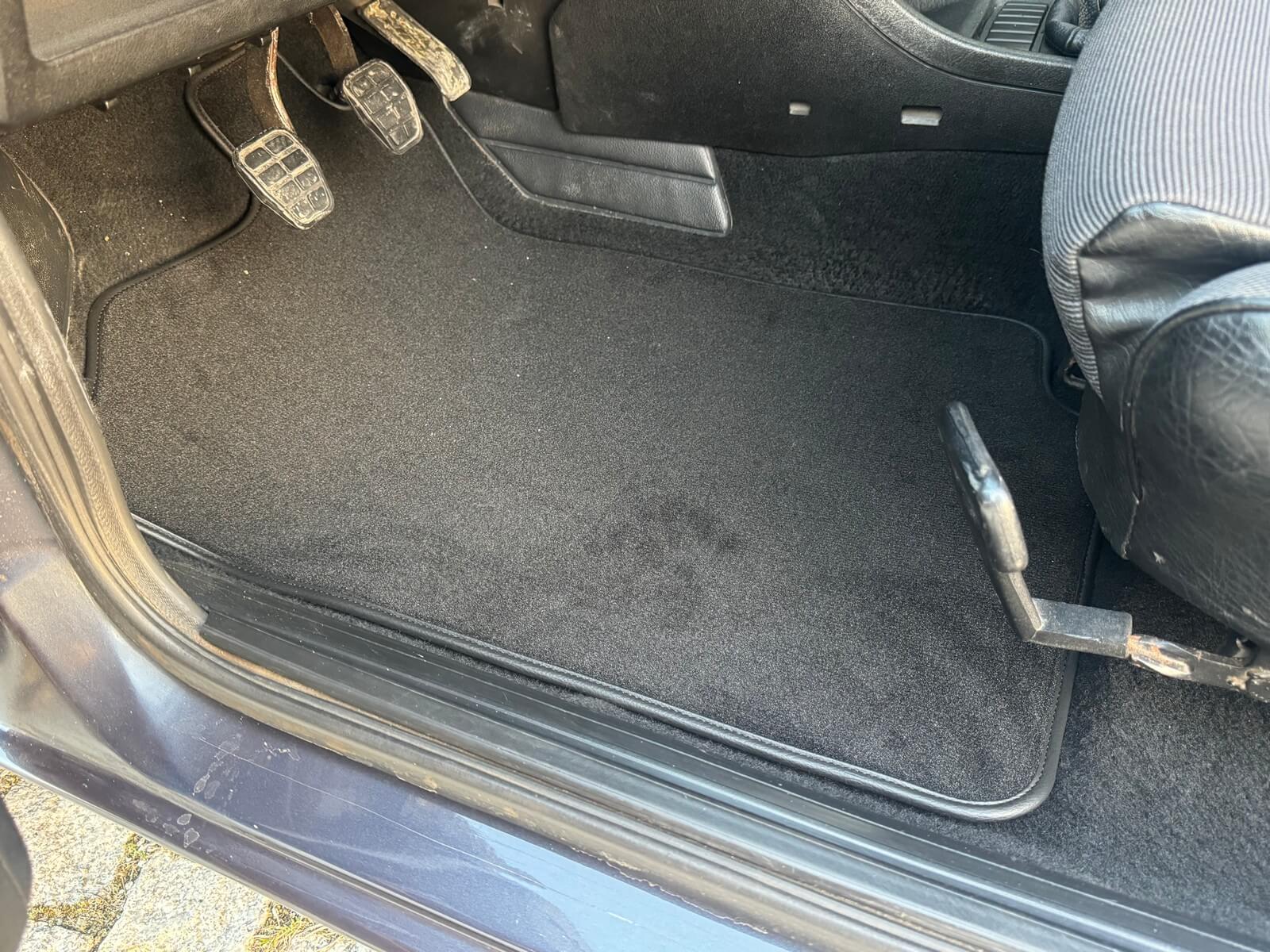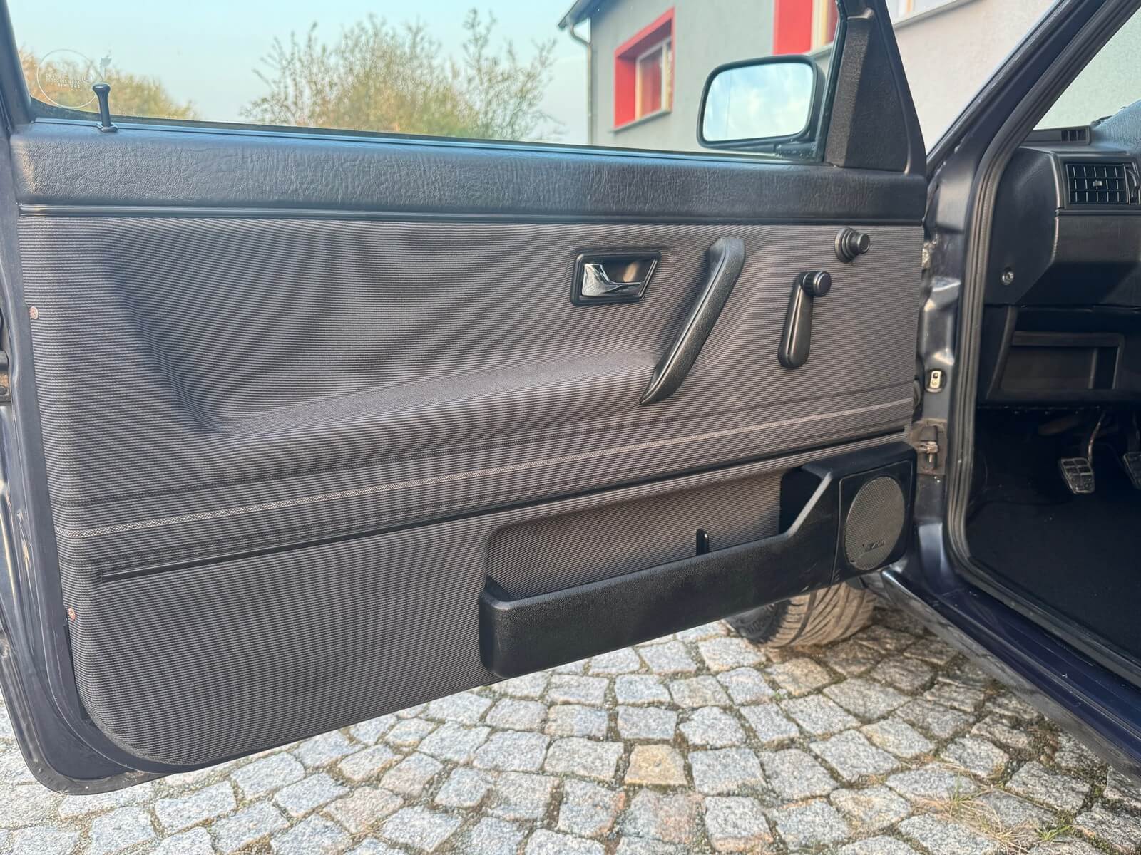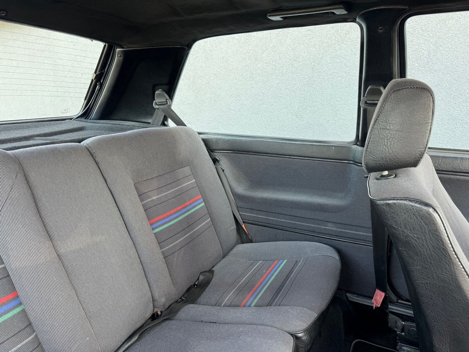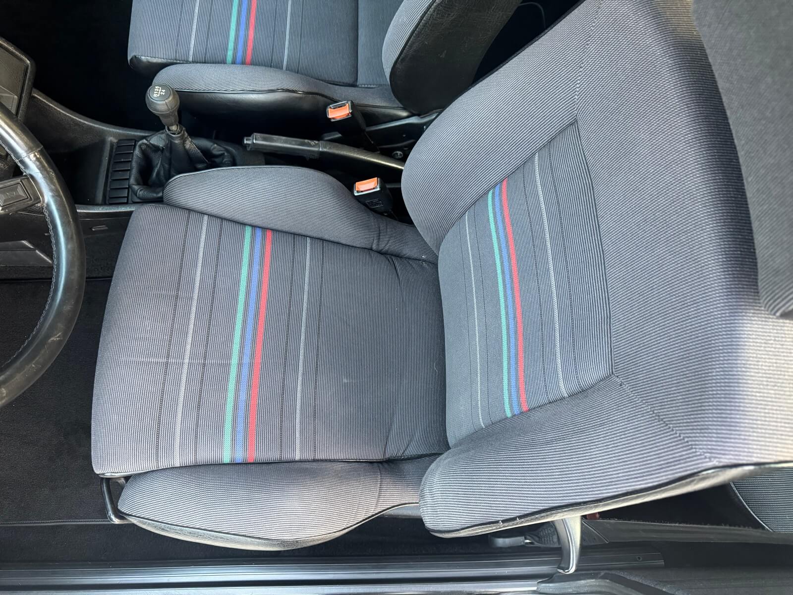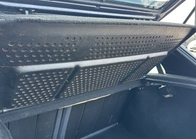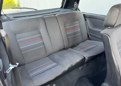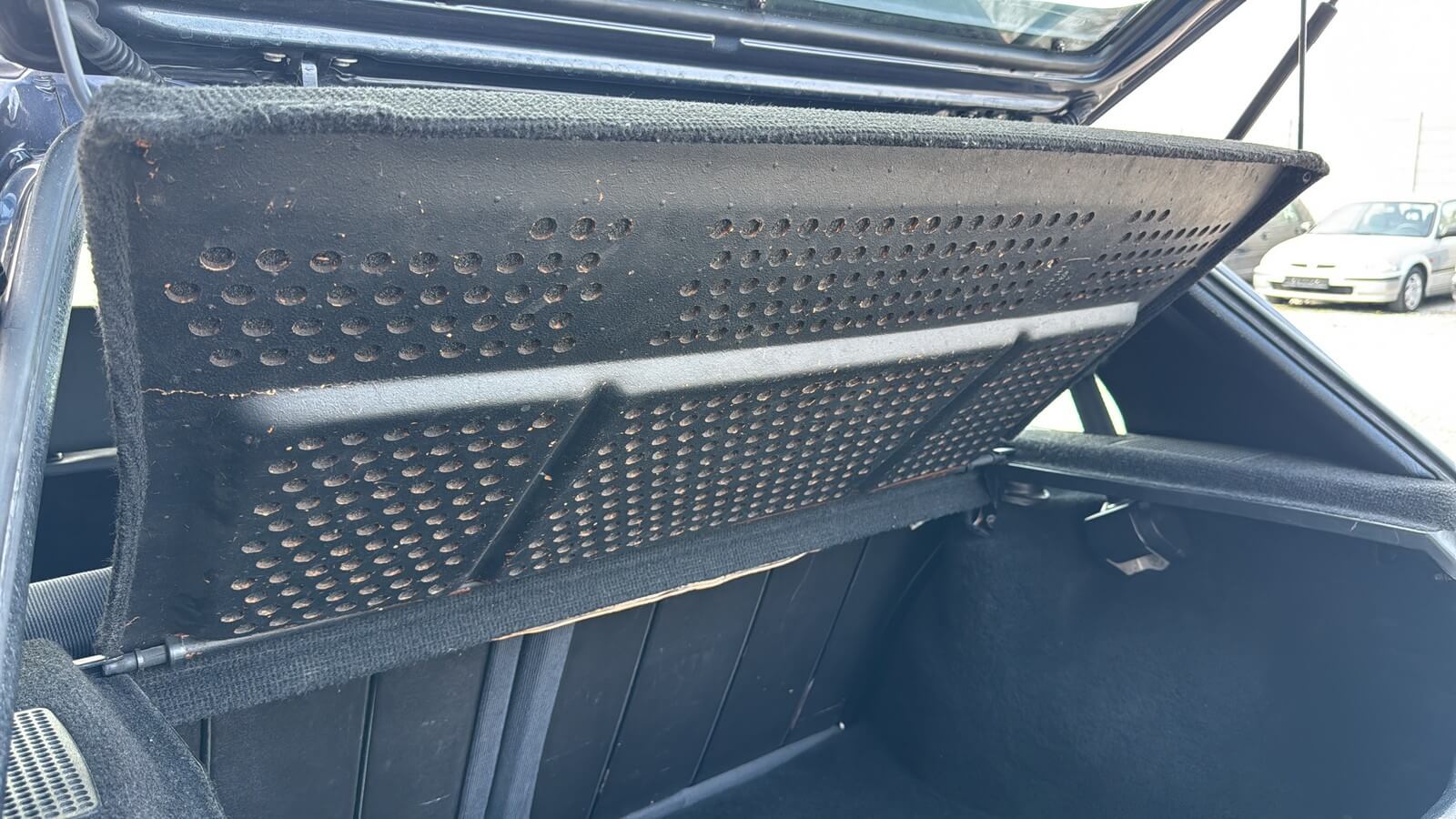 Wnętrze kompletne bez widocznych uszkodzeń. Tapicerka i wszystkie elementy wciąż oryginalne, nie zniszczone. Brak uszkodzeń materiału. Podsufitka czarna, materiał odchodzi w kilku miejscach. Ogólny stan bardzo ładny bez uwag. Radio Philips z 1989 roku, cztery głośniki. Dywaniki jak nowe. Tylna półka w stanie idealnym bez dziur czy uszkodzeń. Dwie gałki zmiany biegów: oryginalna oraz akcesoryjna piłeczka.