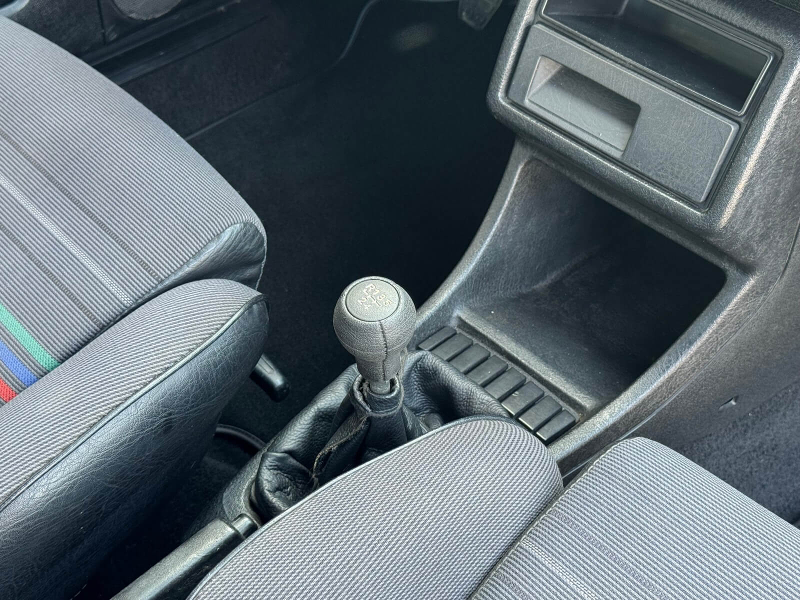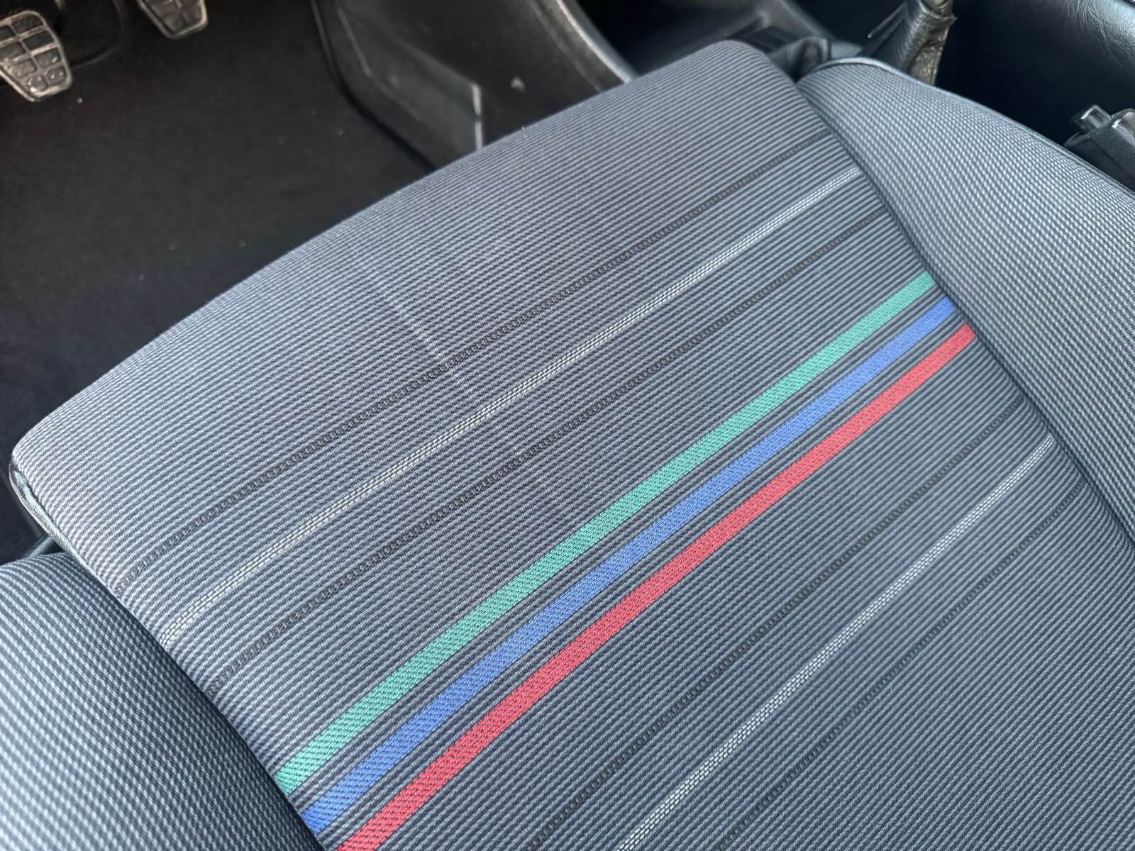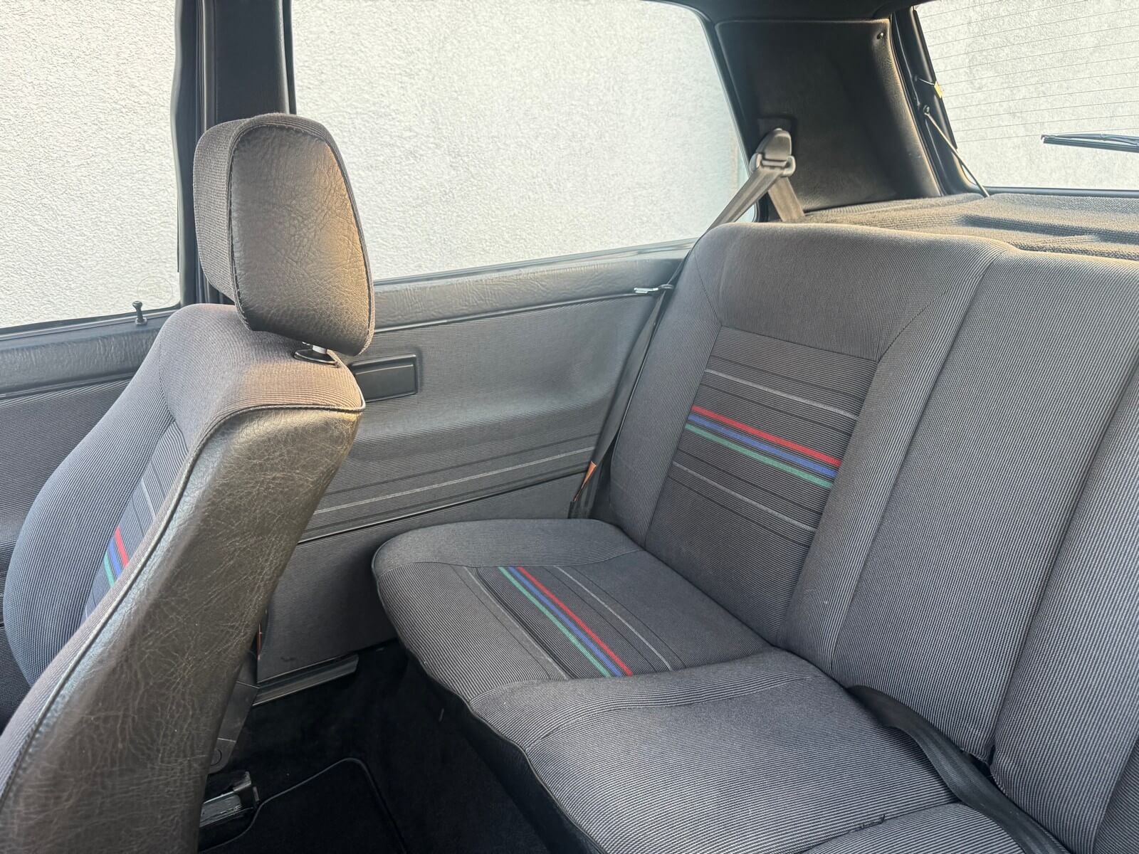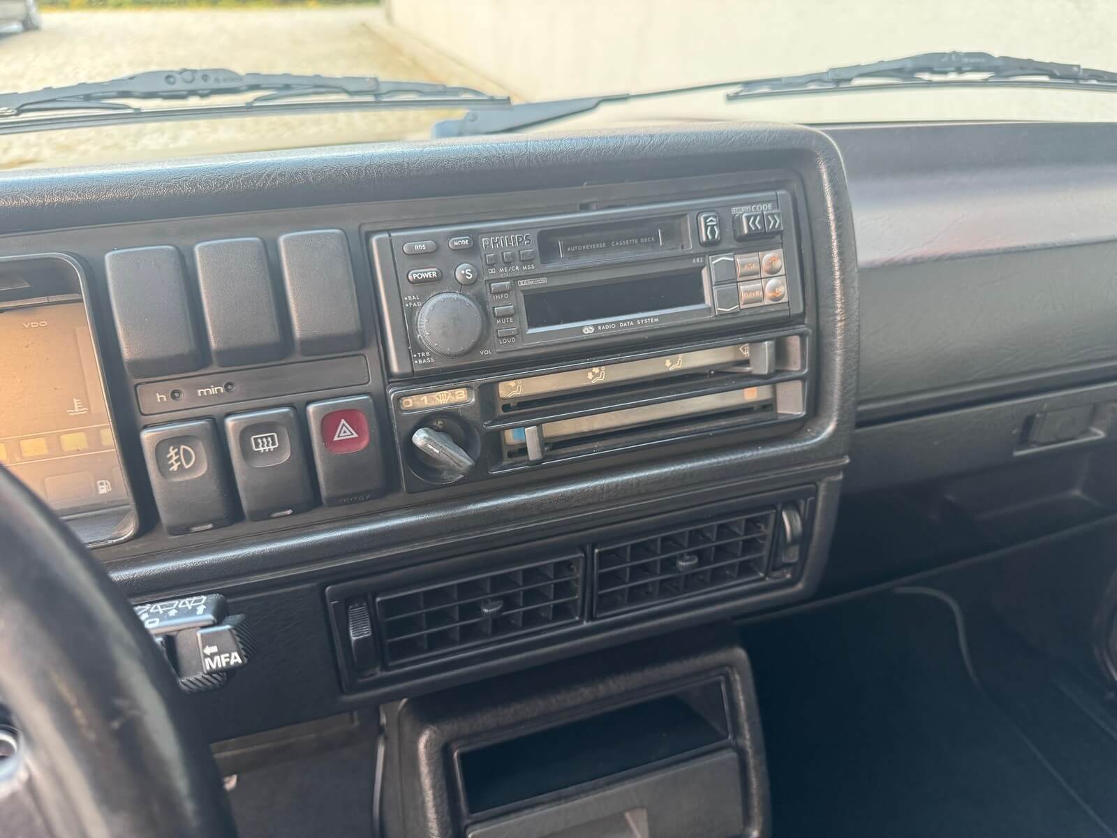 Wnętrze kompletne bez widocznych uszkodzeń. Tapicerka i wszystkie elementy wciąż oryginalne, nie zniszczone. Brak uszkodzeń materiału. Podsufitka czarna, materiał odchodzi w kilku miejscach. Ogólny stan bardzo ładny bez uwag. Radio Philips z 1989 roku, cztery głośniki. Dywaniki jak nowe. Tylna półka w stanie idealnym bez dziur czy uszkodzeń. Dwie gałki zmiany biegów: oryginalna oraz akcesoryjna piłeczka.