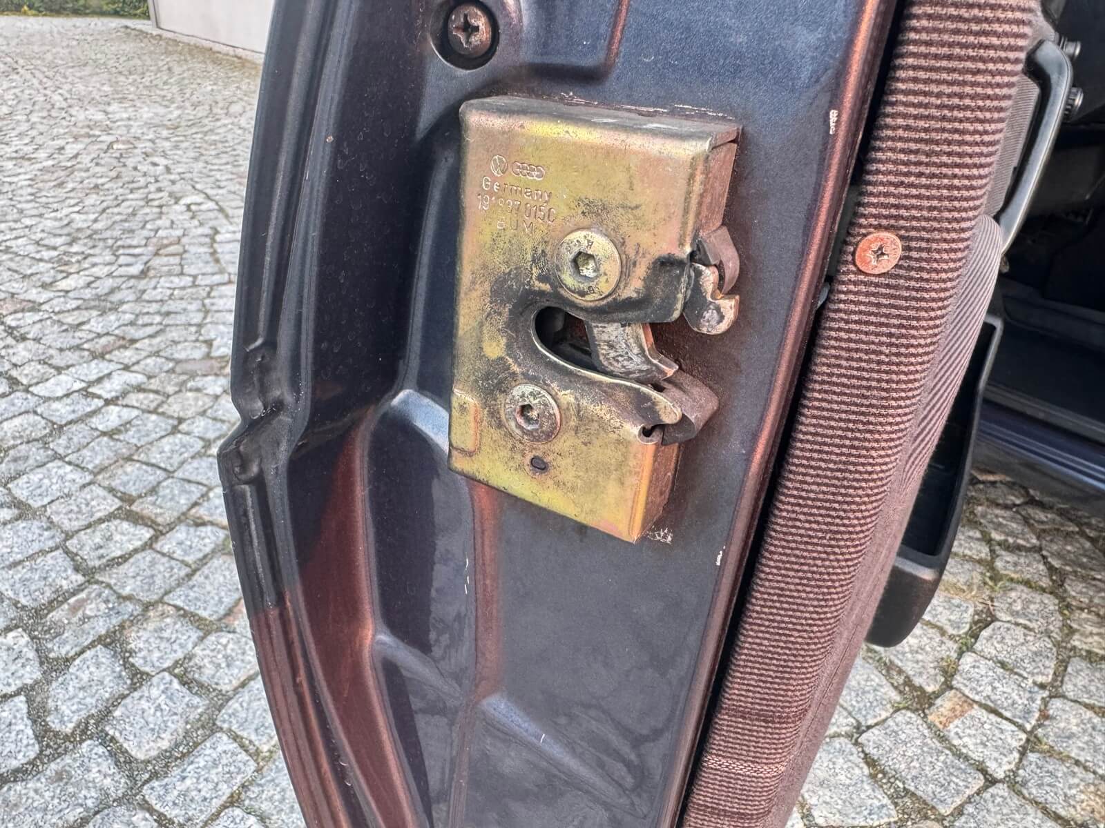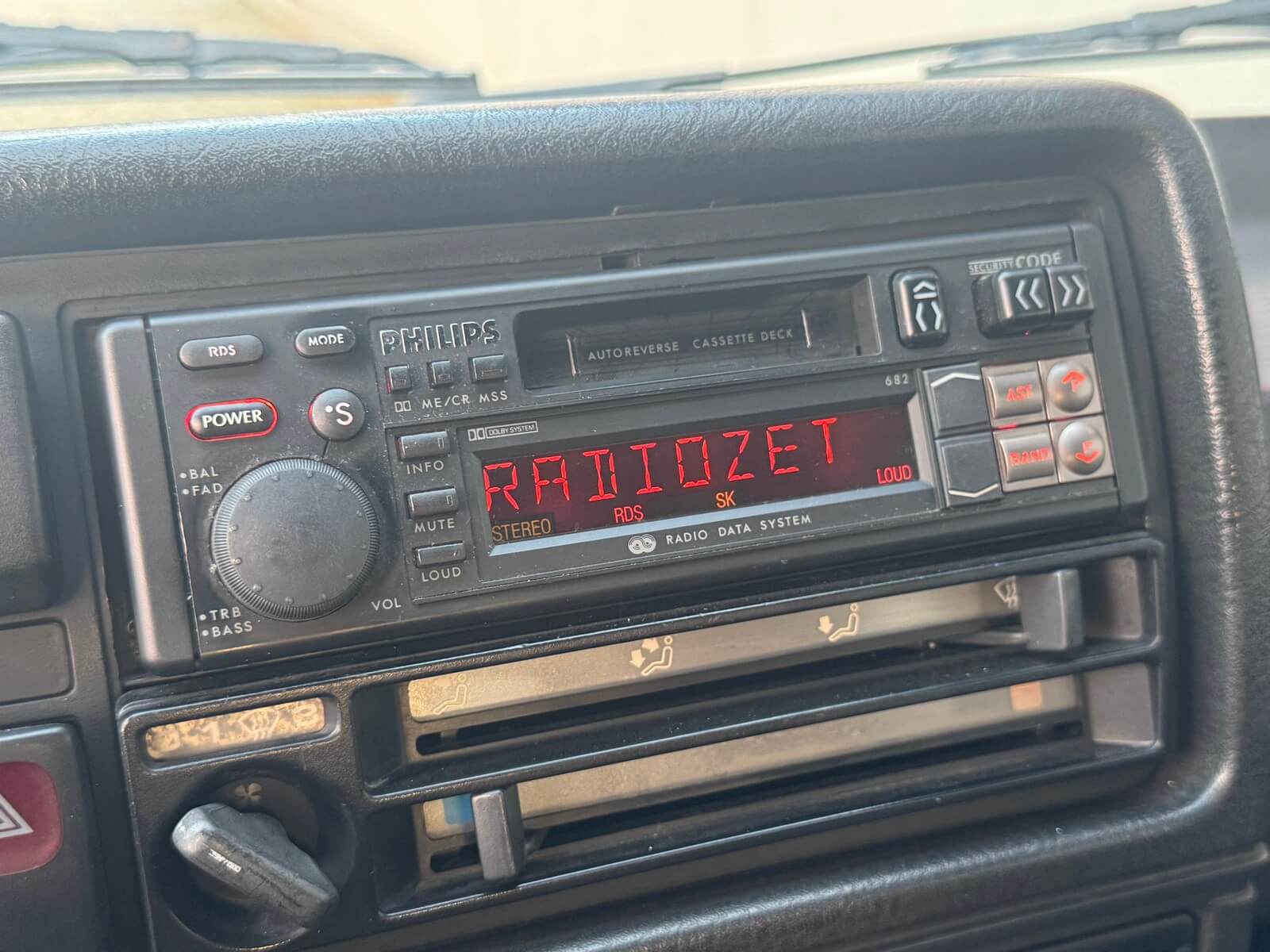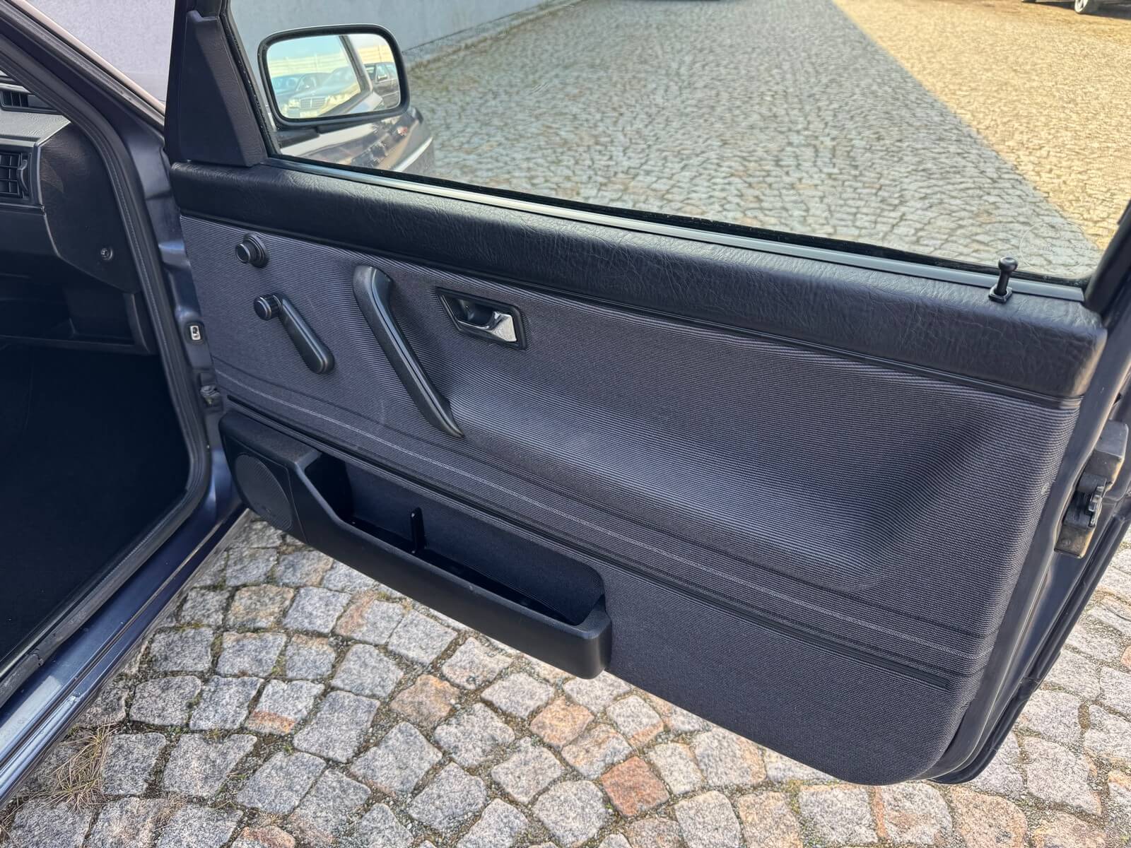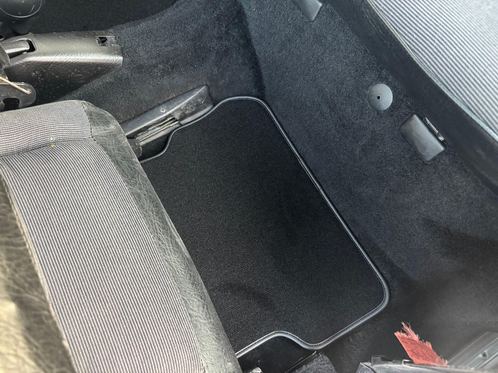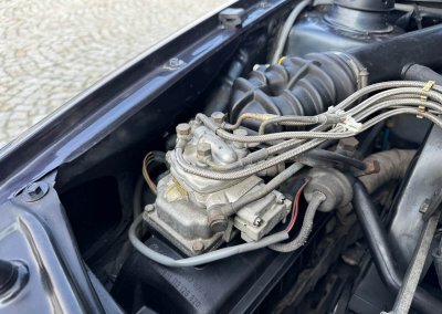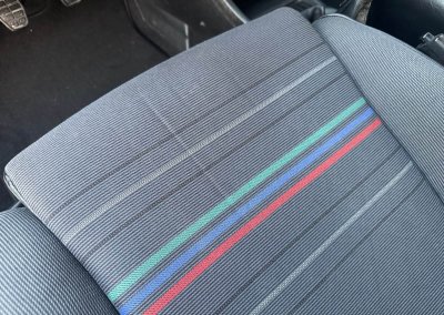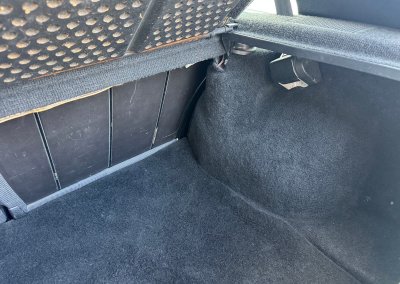 Wnętrze kompletne bez widocznych uszkodzeń. Tapicerka i wszystkie elementy wciąż oryginalne, nie zniszczone. Brak uszkodzeń materiału. Podsufitka czarna, materiał odchodzi w kilku miejscach. Ogólny stan bardzo ładny bez uwag. Radio Philips z 1989 roku, cztery głośniki. Dywaniki jak nowe. Tylna półka w stanie idealnym bez dziur czy uszkodzeń. Dwie gałki zmiany biegów: oryginalna oraz akcesoryjna piłeczka.